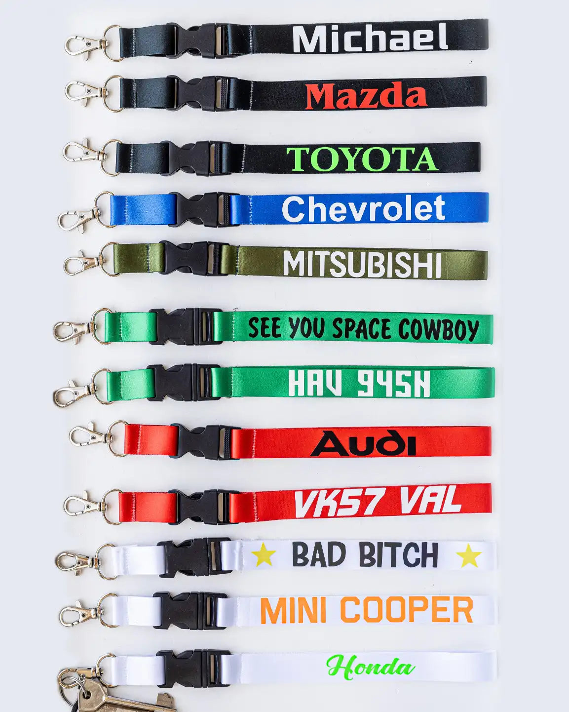 Key lanyards are a practical way to keep your keys and essentials organized while adding a personal touch. Designed for everyday use, these lanyards make it easy to keep your car keys, office keys, or ID badges within reach. You can customize your lanyard by choosing your favorite color and adding custom text to make it truly unique.